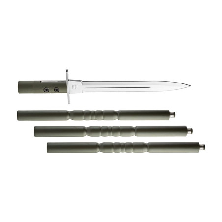 Épieu démontable constitué d'une dague inox avec une lame de 7 mm d'épaisseur et de trois tronçons pouvant être assemblés pour former un épieu de 177 cm.Conçu pour servir le grand gibier : sanglier, chevreuil ou cerf.|Livré dans une mallette ABS noire avec un fourreau cuir pour la lame.