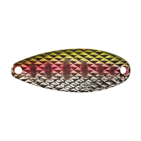 Cuillère ondulante martelée avec effet « Diamant ». Ce marquage spécifique dégage un éclat distinctif des autres hologrammes utilisés, et permet une plus grande longévité du revêtement. Nage relativement serrée.