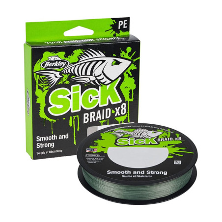Tresse PE 8 brins Berkley SICK, ligne haute performance super lisse avec faible allongement et haute résistance aux nœuds. Grâce au revêtement Nano avec polymère microcristallin, il est très résistant à l'abrasion. Les lignes SICK sont conçues pour pêcher le brochet, le sandre, la perche et la truite.Zéro étirement : pour une sensibilité exceptionnelle, vous aide à attraper des poissons dans les conditions les plus difficiles. • Force supérieure des nœuds : les lignes PE Berkley SICK à 8 brins garantissent des nœuds solides et sûrs. • Haute performance : lignes conçues avec la technologie nano microcristallin qui offre une grande résistance à l'abrasion et une grande fluidité pour un passage dans les anneaux optimisé. • Polyvalent : la tresse Berkley SICK PE est conçue pour attraper tous les poissons carnassiers nageant dans nos eaux européennes comme ; Brochet, Sandre, Perche ou Truite.