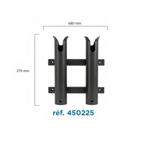PORTE CANNES PVC SEANOX.¤La solution économique pour le rangement de vos cannes à pêche sur votre bateau.¤De nombreuses ouvertures sont prévues pour entreposer vos leurres et outils¤- Tube ø 45 mm intérieur¤¤- Hauteur : 275 mm¤- Emplacement porte moulinet : h 55mm x 16mm de largeur¤- 4 trous de fixation Ø 4.5mm¤-Livré avec visserie¤- Largeur 2 cannes :230mm¤- Largeur 3 cannes :320mm¤- Largeur 4 cannes :450mm