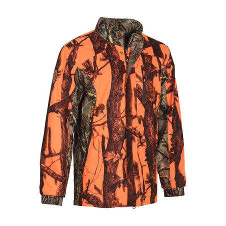 Veste réversible, 100% polyester avec une membrane imperméable et respirante, coutures étanches. 1 poche poitrine avec zip étanche, 2 grandes poches avec zips étanches et cartouchières intégrées, capuche amovible et intégrée au col. Carnier avec doublure étanche et lavable. Côté GhostCamo B&B normé CE.
