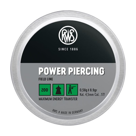 En tant que leader pour les munitions pour armes à air comprimé, la marque RWS garantit dans le monde entier l’excellence de la qualité et de la technologie. Des décennies d’expérience dans la production de balles à étranglement (Diabolo) soutiennent une avance impressionnante. Les balles à air RWS se distinguent par une composition de matériaux particulièrement contrôlée, la qualité spécifique de la surface et le poids optimisé, ce qui assure d’excellentes valeurs de précision. La totalité des balles match RWS sont élaborées dans la forme classique Diabolo. Le guidage de la tête, la partie arrière et la forme spécifique de la tête de balle sont décisifs pour la stabilisation optimale de la balle dans le canon de même que pour la netteté des perforations dans la cible. Des tolérances de fabrication très strictes alliées à des tests rigoureux ont complété l’optimisation de la précision. Il s’agit ici d’une nouvelle définition de la qualité. La gamme offre une sélection complète de balles de précision pour les compétitions et l’entraînement ainsi que de nombreuses formes spéciales pour domaines d’application spécifiques. Cinq gammes de produits clairement structurées vous facilitent le choix pour chaque domaine d’application. Que ce soit pour le tir en compétition internationale ou en association, à l’entraînement ou pour le sport de masse, les balles à air RWS sont garantes d’une précision et d´une fiabilité absolues.||La RWS POWER PIERCING est une balle à air pointe creuse plate avec une extrémité en plomb.|Les avantages en un coup d‘oeil :|• Combinaison parfaite de l‘avantage d‘une pointe creuse et d‘une extrémité pointue.|• Un maximum d‘impact et un plus grand transfert d‘énergie dans la cible.|• Forte expansion de la balle.|• Très bonne précision.