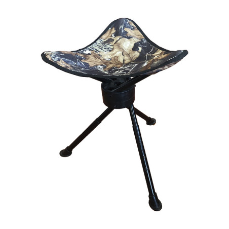 Siège de battue rotatif Trépied avec pied métal, assise textile. Bretelle pour le porter avec deux crochets.|Patte de serrage en bas du pied. Supporte jusqu’à 100 kg. Hauteur ouvert 60 cm Camo forêt