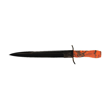 Dague avec impression camo orange sur manche ergonomique recouvert de caoutchouc synthétique pour un meilleur grip. Lame noire 25 cm en acier 420 carbone/chrome. Livré sous blister avec un étui nylon renforcé.|« Article équipé d’une étiquette antivol »