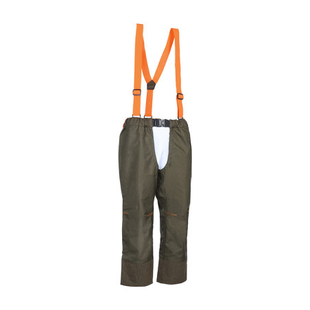 Cuissard de traque ultra-résistant,imperméable et respirant. Cordura 100% polyester très haute résistance et renforts en Armortex. Tissus enduits polyuréthane, coutures étanches. Doublure 100% polyester. Bretelles élastiques orange, ajustables et amovibles. Ceinture élastiquée anti-glisse. Boucle de fermeture trois points. Une poche arrière étanche et deux fentes de côté passe-main.|Genoux préformés pour une meilleure ergonomie. Passant de ceinture à l'intérieur.