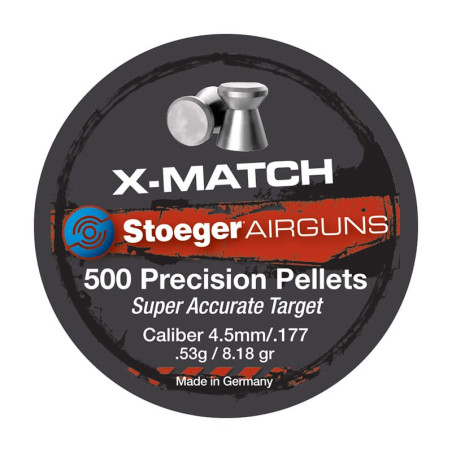 Plombs de précision pour carabines à air compriméChaque tireur a des attentes spécifiques et le choix de sa munition est essentiel. Notre gamme, finement sélectionnée, vous offre un vaste choix de types de plombs et de poids qui satisferont toutes les exigences. La précision est la combinaison de plusieurs paramètres parmi lesquels la qualité des plombs est le facteur le plus important. Les plombs Stoeger sont fabriqués en Allemagne avec un savoir faire inégalé et une technologie de pointe.||MatchTrès grande précision pour les tireurs orientés compétition. Groupements performants, fabrication très soignée. Tête plate, jupe lisse, 0,53 g. Calibres 4,5 mm.
